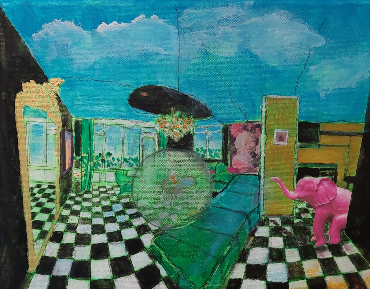 In een ander werk zie je een figuur die door de lucht zweeft, hoog boven een huis, omgeven door zachte wolken. Dit schilderij gaat over vrijheid en loslaten. Het dambordpatroon leidt je naar het huis, maar de figuur vliegt erbovenuit, los van de zwaartekracht. Voor mij symboliseert dit de wens om boven alles uit te stijgen – de chaos van het dagelijks leven, de zorgen, en de twijfels – en jezelf de ruimte te geven om te dromen.
