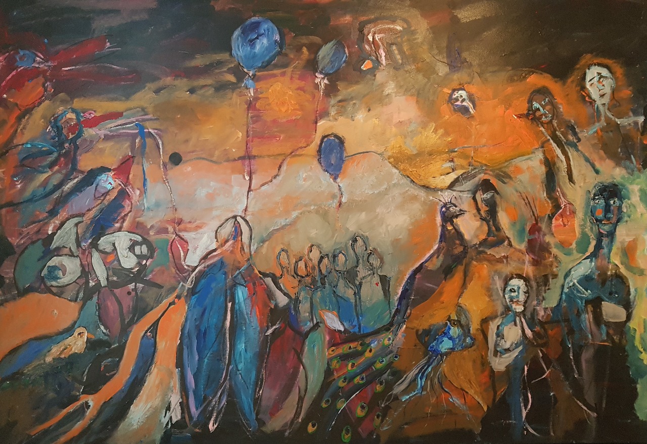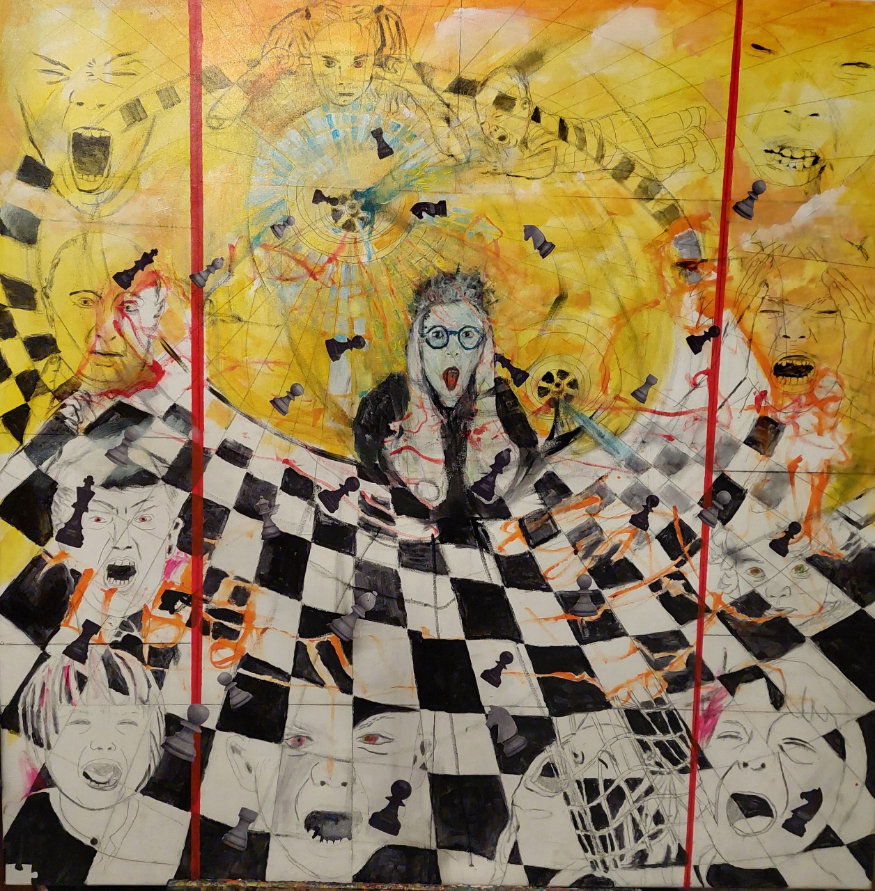 In mijn atelier, mijn persoonlijke escaperoom, schilderde ik wat er zich diep in mij afspeelt. Geïnspireerd door een schilderijtje van mijn vijfjarige kleindochter, waarin ze liefdevol haar familie verbeeldde, werd ik geconfronteerd met een harde realiteit. Terwijl zij haar papa, mama, zusjes, en grootouders schilderde, dacht ik aan de kinderen die opgroeien in een wereld vol oorlog en geweld. De onschuld van haar kinderlijke wereld staat in schril contrast met de beelden die dagelijks op ons netvlies komen.